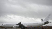 French authorities hung white tarps across the soaring bay windows of the small Vatry Airport in Champagne country to ensure privacy for the passengers held inside. The unmarked A340 plane, grounded since Thursday, can be seen parked near the terminal. Other flights were canceled or rerouted as the airport was transformed into the hub of a vast trafficking investigation.