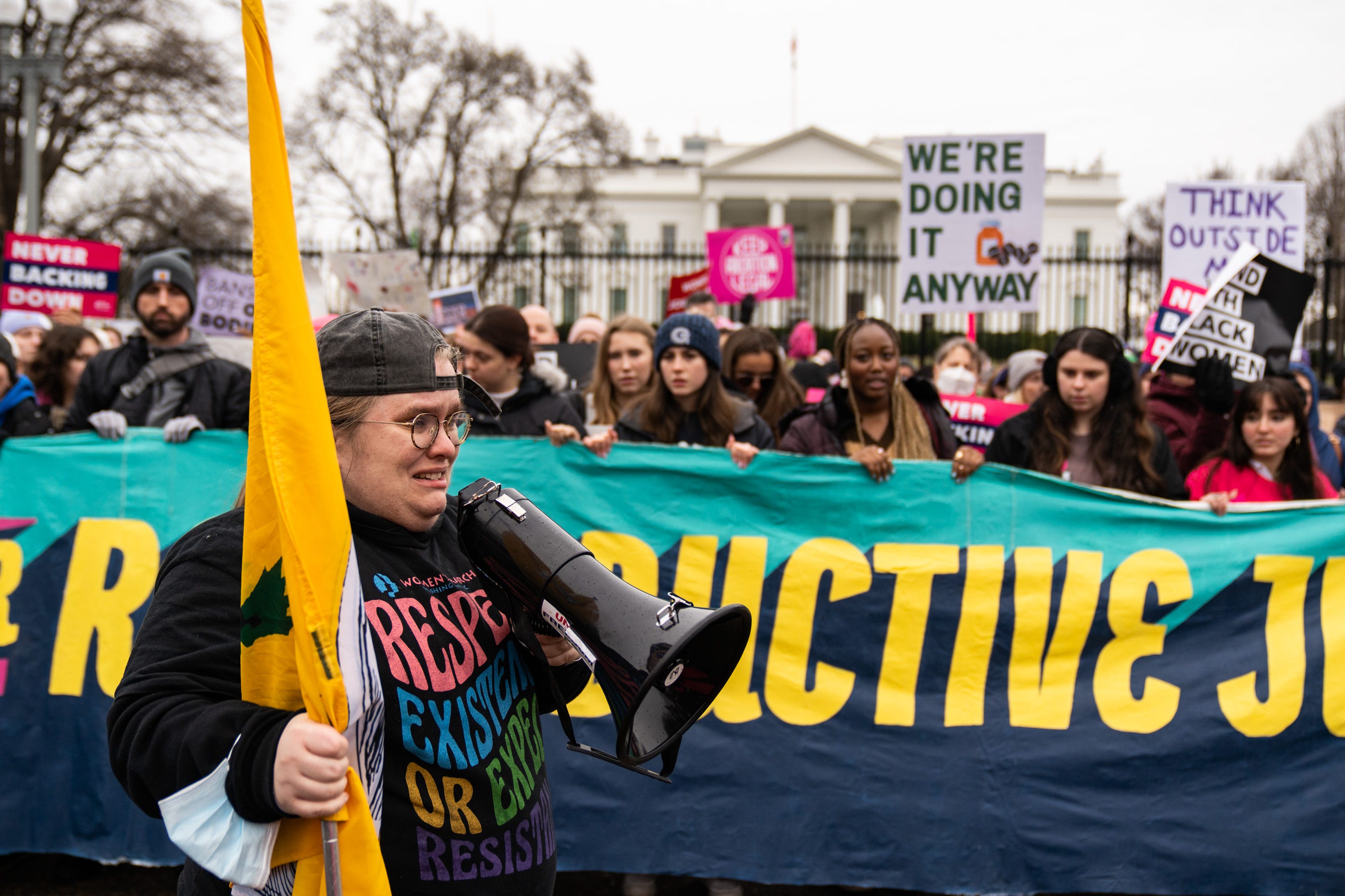 The marchers got underway a few minutes early, making their way through an otherwise mostly empty downtown Washington, chanting, “Our bodies, our choice” and “Our rights are not up for debate” as they went. Those chants continued as the group stopped on Pennsylvania Avenue in front of the White House.